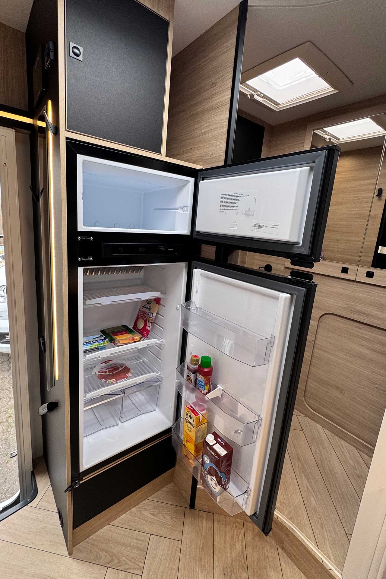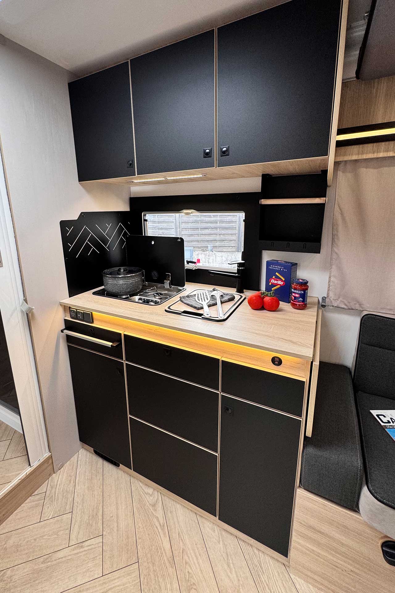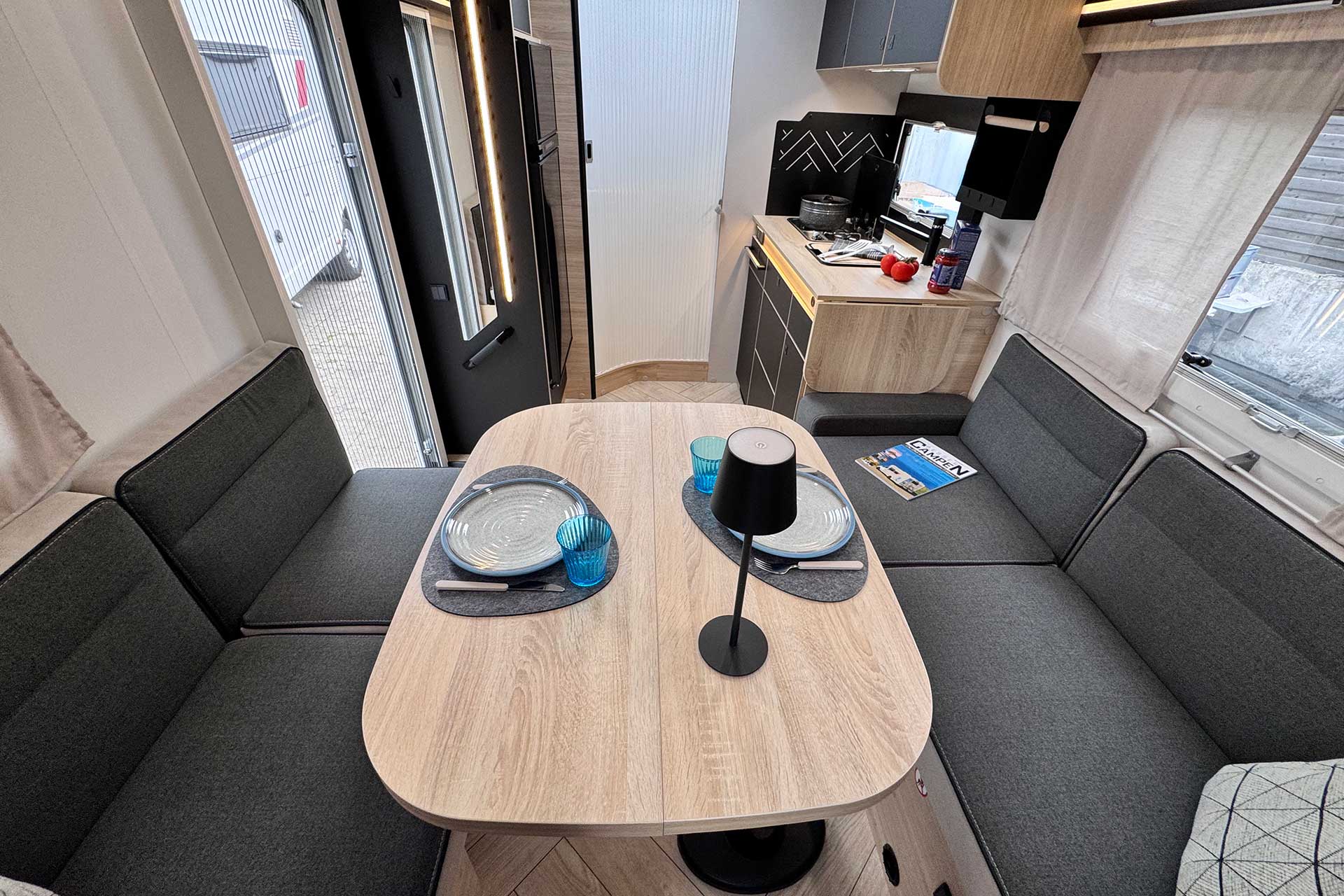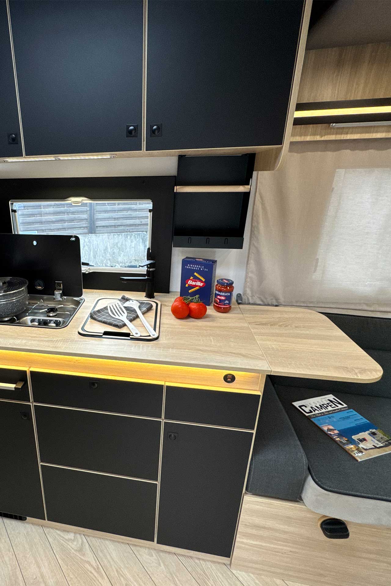 Doch das ist längst nicht alles. Die geräumige Küche bietet besonders viel Stauraum und Arbeitsfläche. Das durchdachte Raumbad mit integriertem Ankleidebereich sowie der Zugang zur Heckgarage über eine praktische Durchstiegsluke zeigen, wie effizient und clever hier jeder Zentimeter genutzt wurde und das auf unter sieben Metern Gesamtlänge.