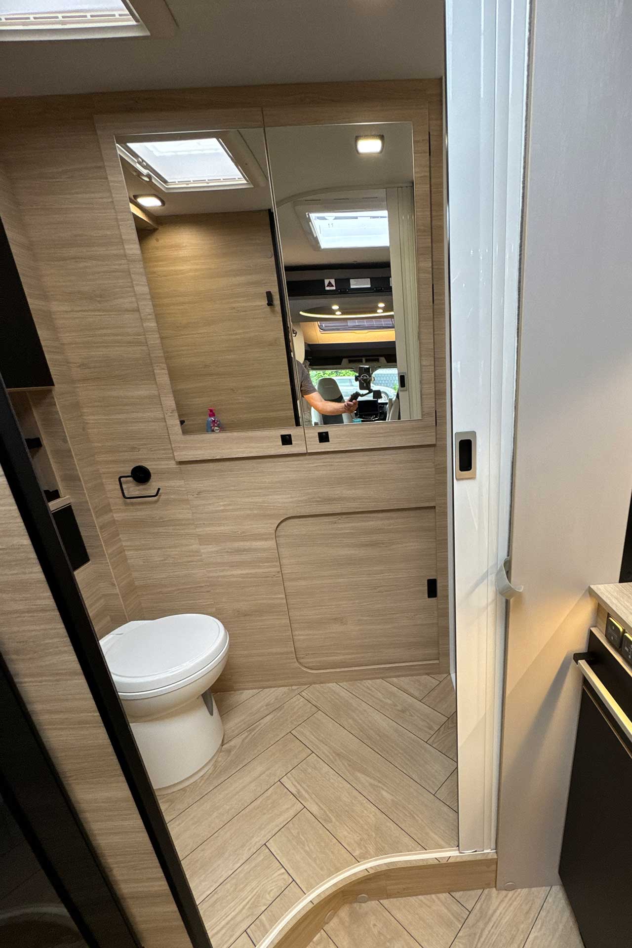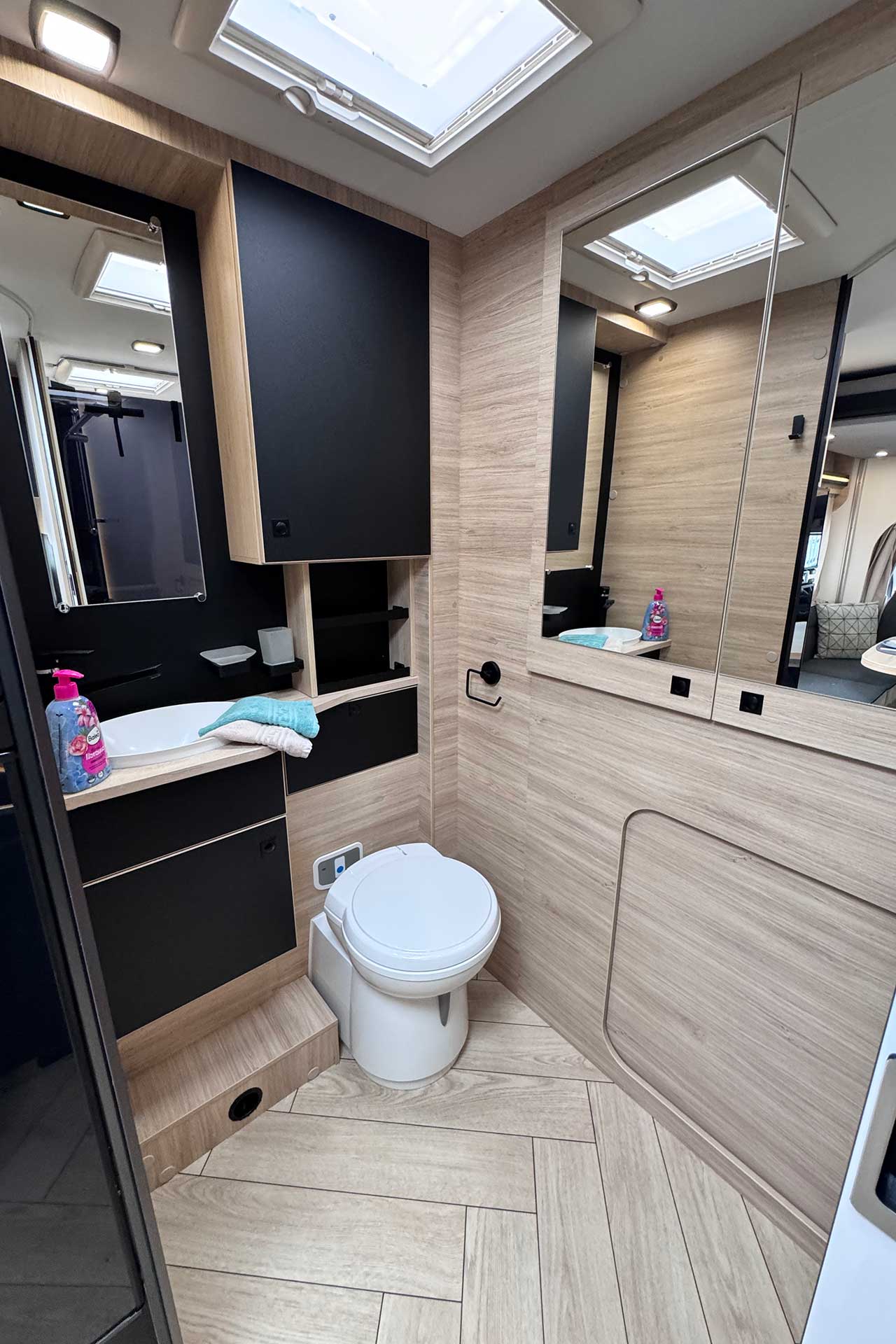 Betrittst du das Badezimmer, fällt dein Blick sofort auf die großen Spiegeltüren des Kleiderschranks. Ein weiteres praktisches Detail: Unter dem Kleiderschrank befindet sich die Durchstiegsluke zur Heckgarage – ideal, um jederzeit schnell an dein Gepäck zu kommen.
