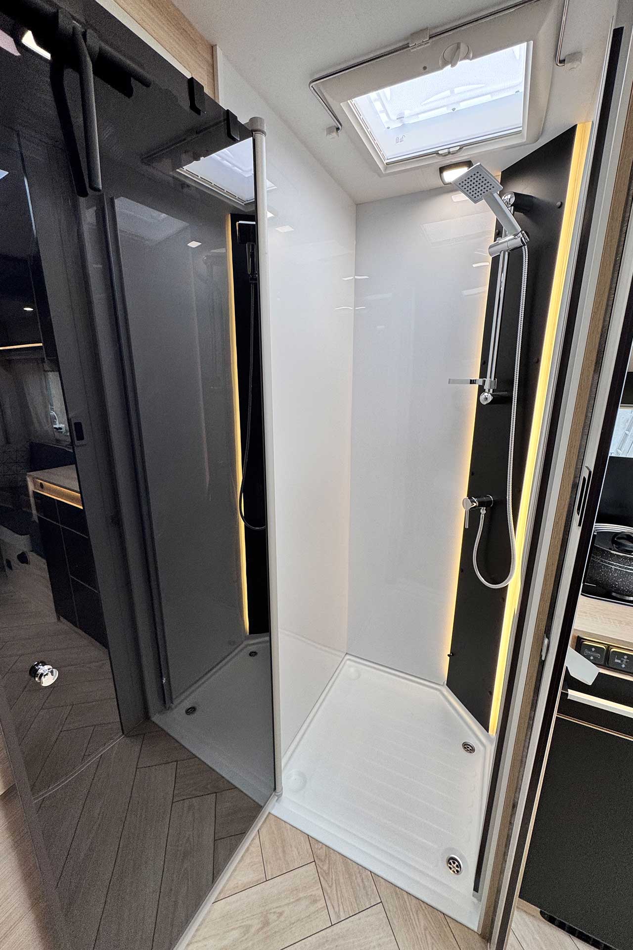 Die Dusche ist so großzügig gestaltet, dass du dich wie im heimischen Bad fühlst. Ein großes Dachfenster sorgt für optimale Belüftung und die stilvolle, indirekt beleuchtete Rückwand verleiht dem Raum einen modernen Look – ein Detail, das du vielleicht ebenfalls schon in anderen Challenger-Modellen gesehen hast.