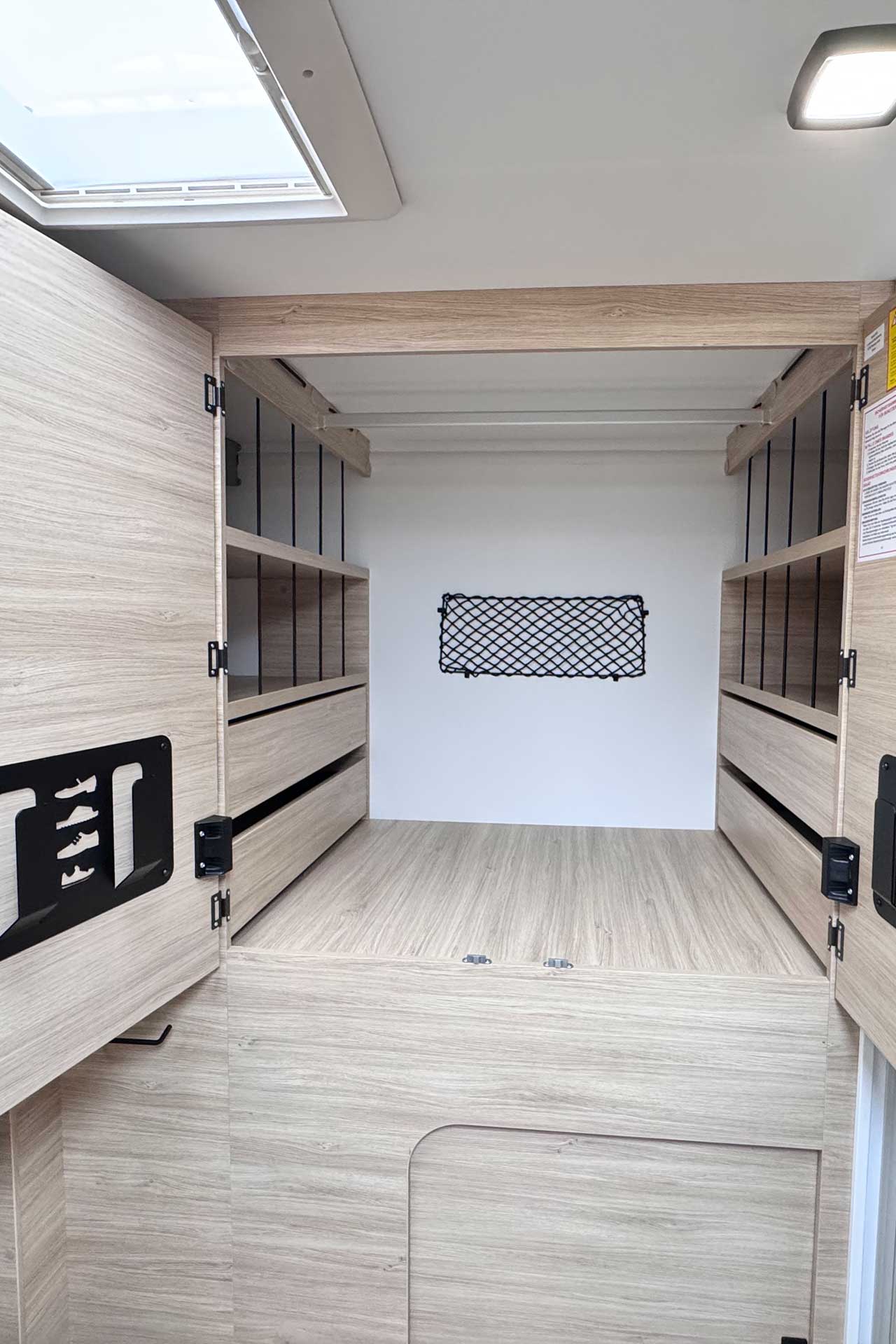 Ein besonderes Highlight bei unserer LIVA ist die extrahohe Tür auf der Fahrerseite. Sie ermöglicht es, ein oder zwei SUP- oder Surfboards senkrecht zu verstauen. Wer diesen Stauraum anderweitig nutzen möchte, kann klappbare Zwischenböden einsetzen – maximale Flexibilität inklusive. In der großzügigen Heckgarage finden darüber hinaus alle weiteren Campingutensilien Platz – bis hin zum E-Bike.