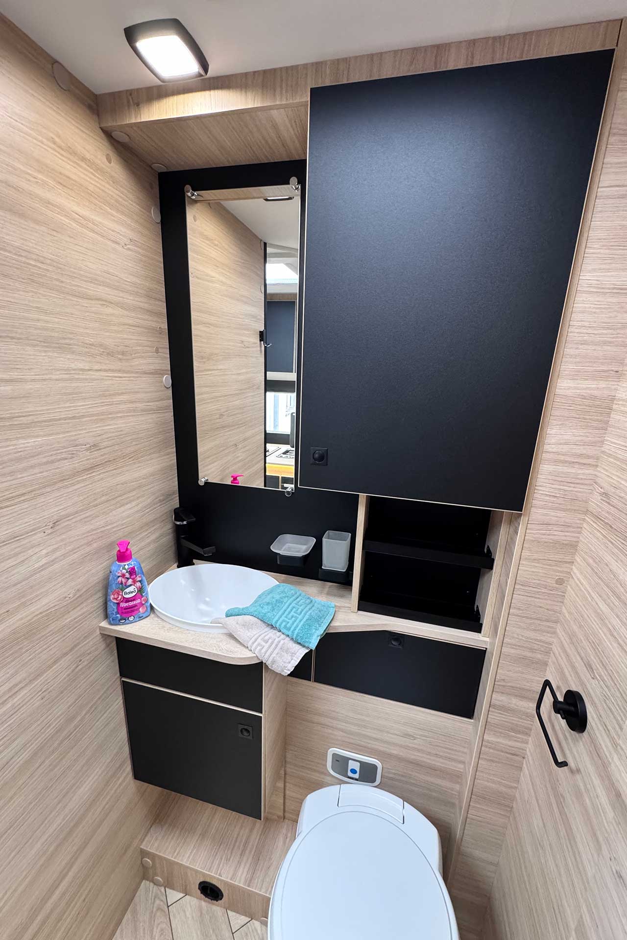 LIVA bietet dir ein vollwertiges Bad, das mit durchdachten Details punktet: WC, modernes Waschbecken mit Spiegel, Stauraum für Pflegeprodukte und natürlich praktische Extras wie Zahnbürstenhalter und Seifenschale, wie du sie aus anderen Fahrzeugen der Challenger- oder Chausson-Serie kennst.