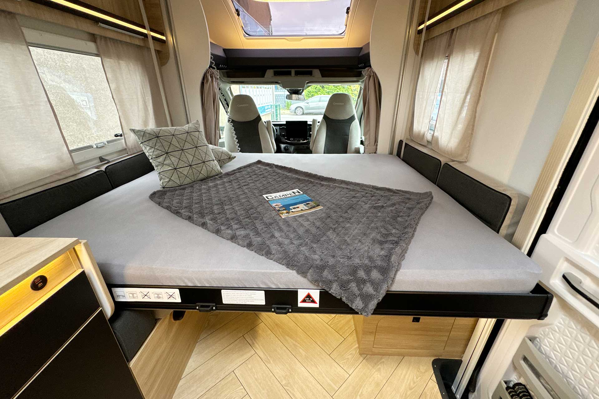 Schlafen wie auf Wolken … Das 160 cm breite Hubbett über der Sitzgruppe bietet zwei Personen eine bequeme Schlafmöglichkeit. Bei Reisen zu zweit ist es besonders praktisch: Per Knopfdruck lässt sich das Bett auf eine komfortable Höhe absenken – Ein- und Aussteigen wie im normalen Bett. Morgens einfach hochfahren und schon ist alles wieder aufgeräumt.