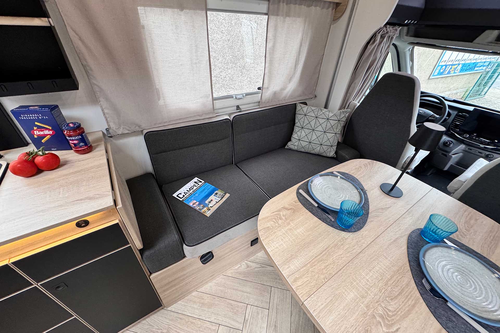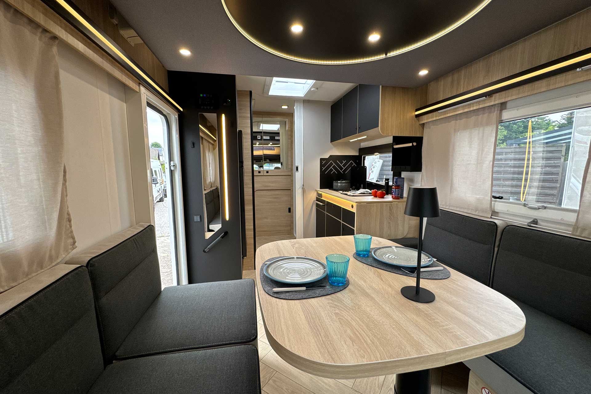 Das angesagte Möbeldesign, das du bereits aus unseren Challenger-Fahrzeugen kennst, zeigt sich auch bei LIVA in seiner schönsten Form. Die großzügige Face-to-Face-Sitzgruppe – vielleicht kennst du sie schon von JESPER oder STEEN – sorgt zusammen mit dem Hubbett darüber für eine gemütliche Wohnatmosphäre. Besonders die indirekte Beleuchtung und die integrierten Spotlights schaffen ein stimmungsvolles Ambiente.