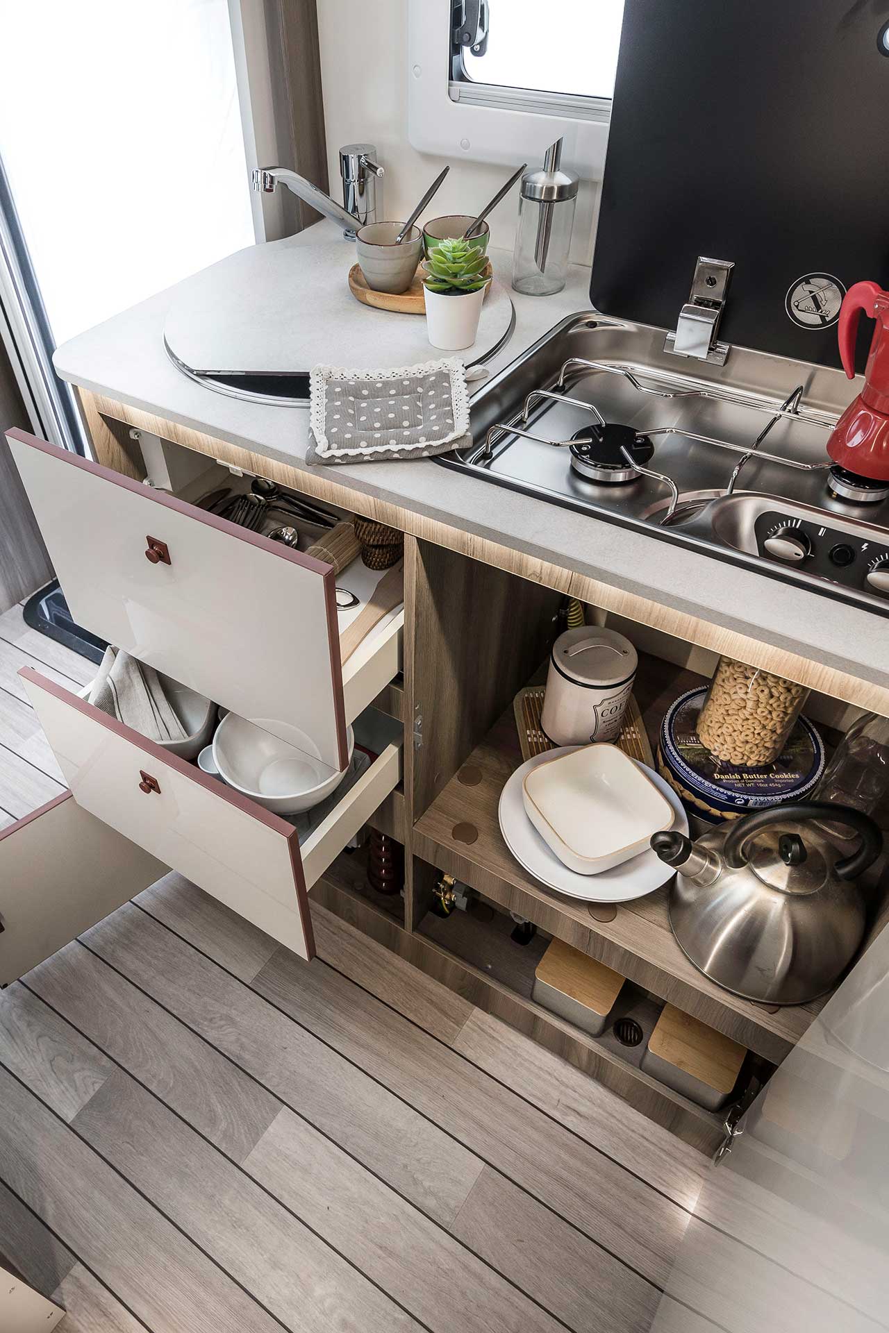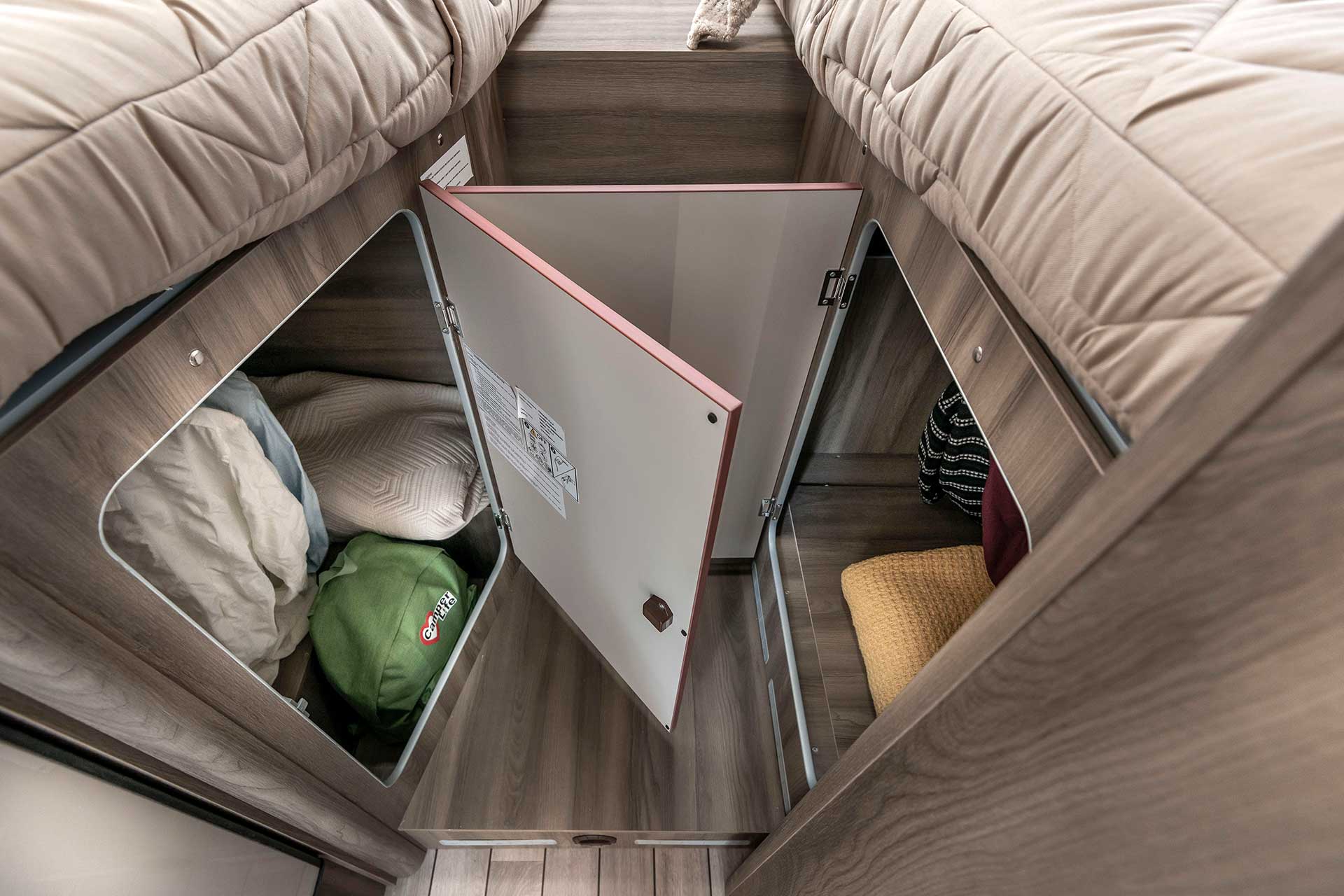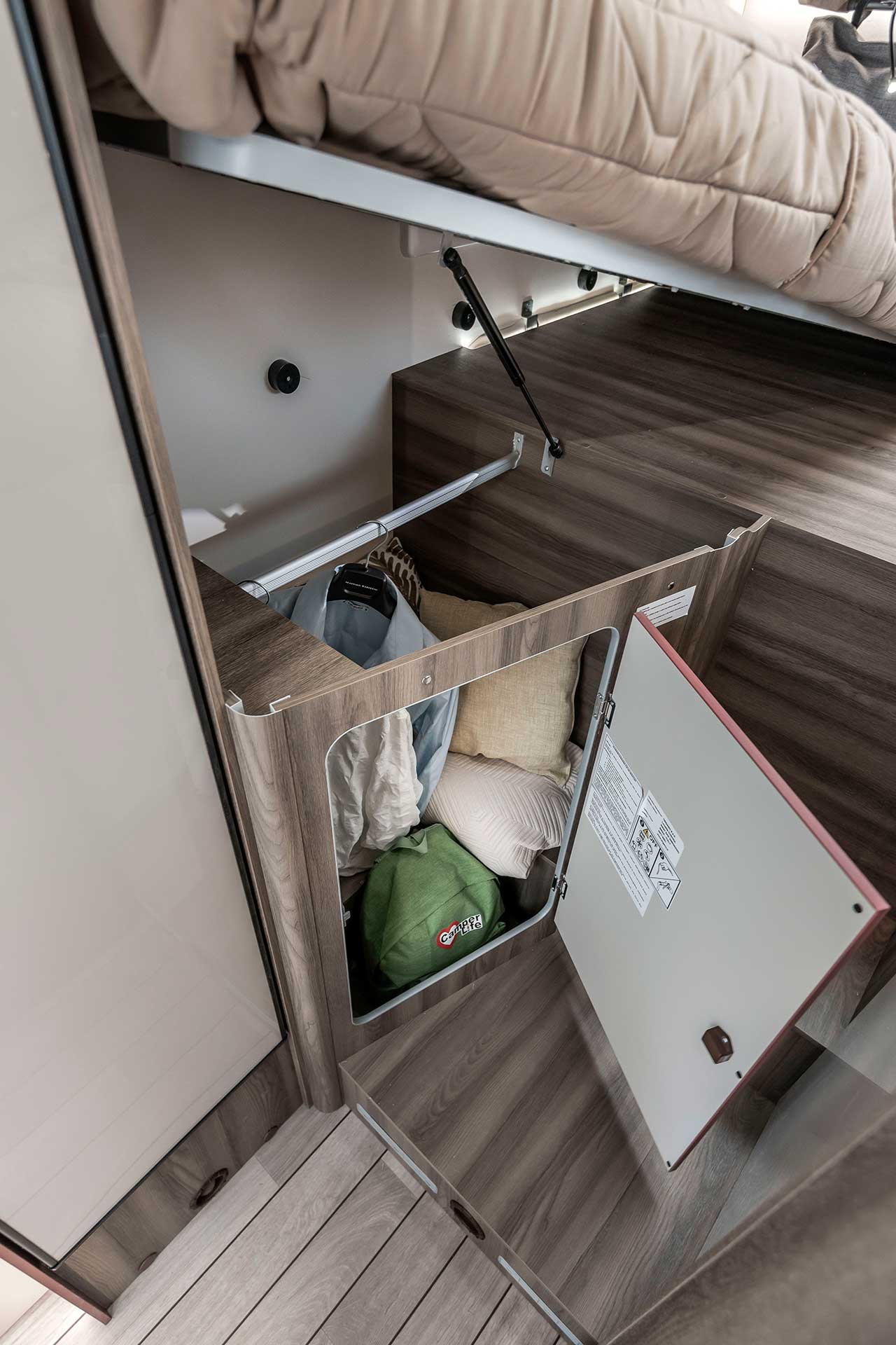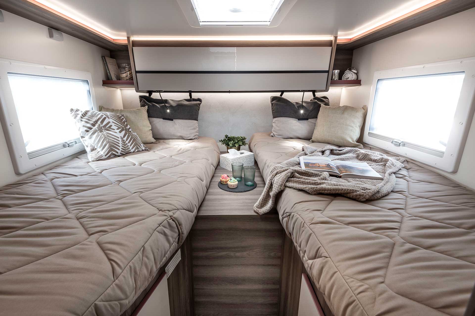 Die Innenausstattung ist komplett auf Funktionalität ausgerichtet. Durch die hochklappbaren Betten kommst du mühelos auch von oben an den Kleiderschrank und behältst so immer den Überblick.