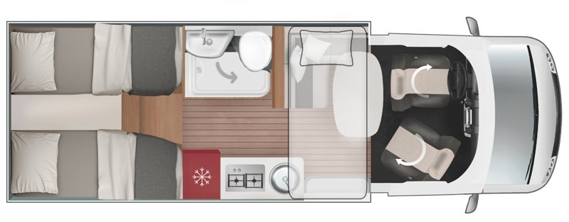 Trotz der kompakten Größe bietet TARJA den gleichen Wohnkomfort wie ein Teilintegriertes, ist aber nur 2,15 Meter breit. Dank des kurzen Radstands ist das Fahrzeug beim Manövrieren besonders wendig, sodass du problemlos überall hinkommst. Durch die kompakten Maße und die geringere Höhe ist TARJA ein ideales Fahrzeug für Wohnmobil-Neulinge.