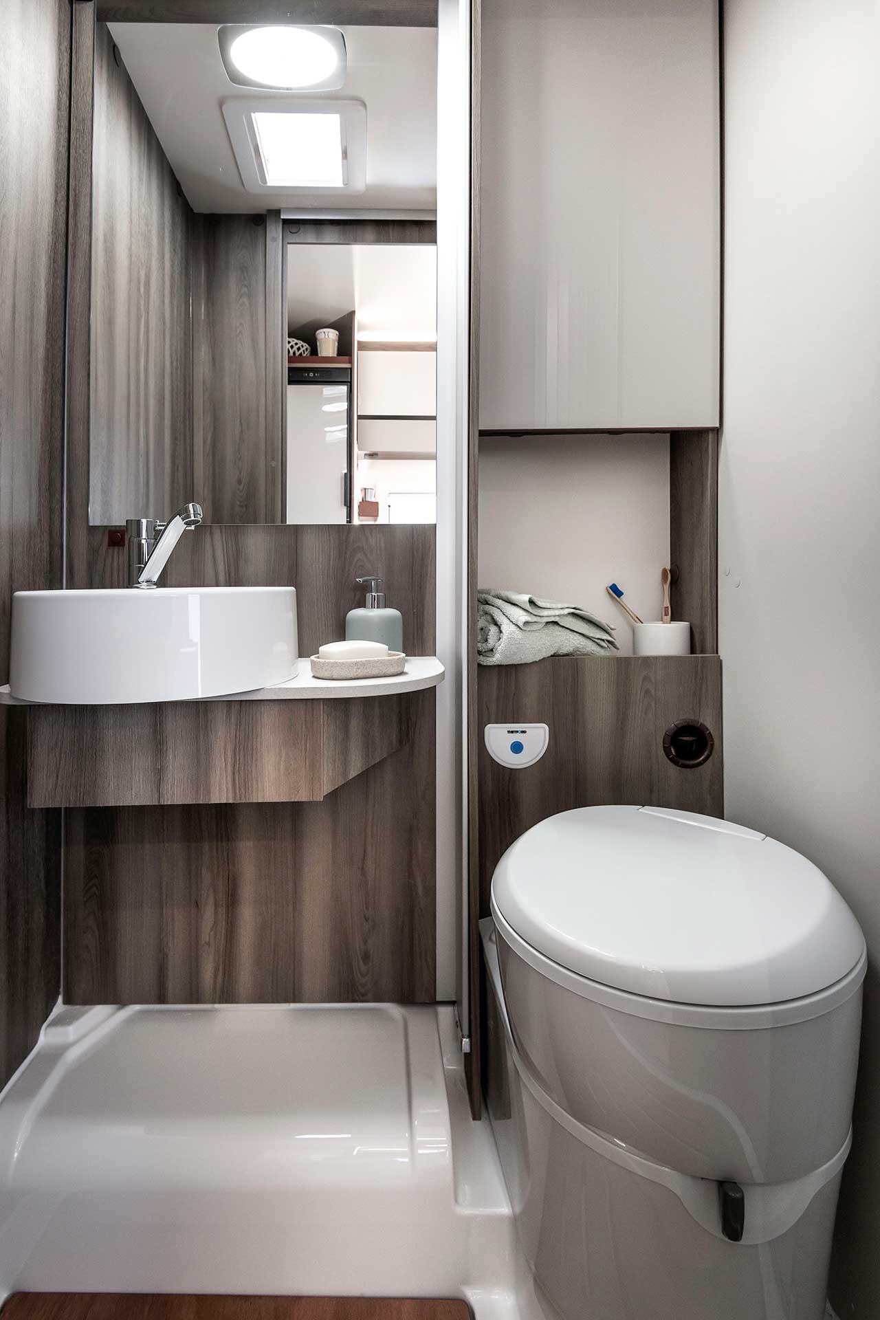 Das modulare Badezimmer ist wirklich clever gestaltet und nutzt jeden Millimeter optimal aus. Wie es sich gehört, gibt es einen geräumigen Schrank, einen großen Spiegel und auch an Ablagemöglichkeiten fehlt es nicht.