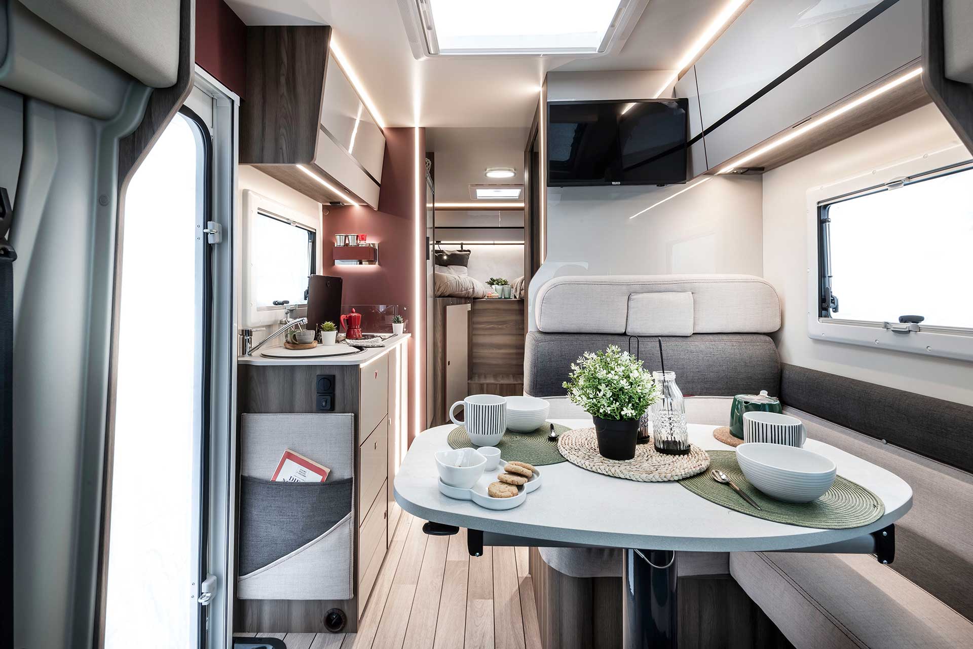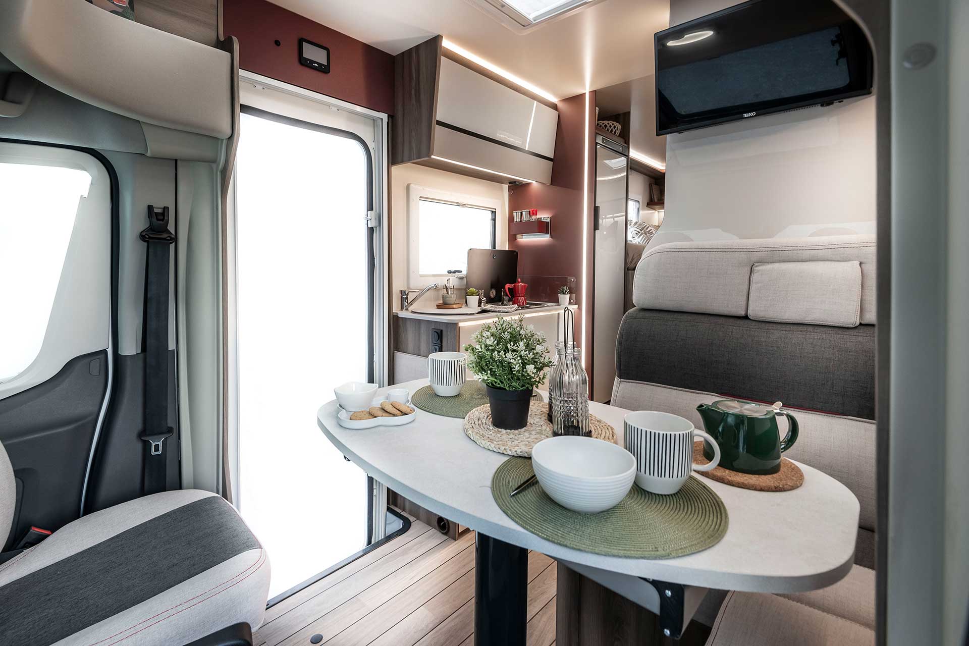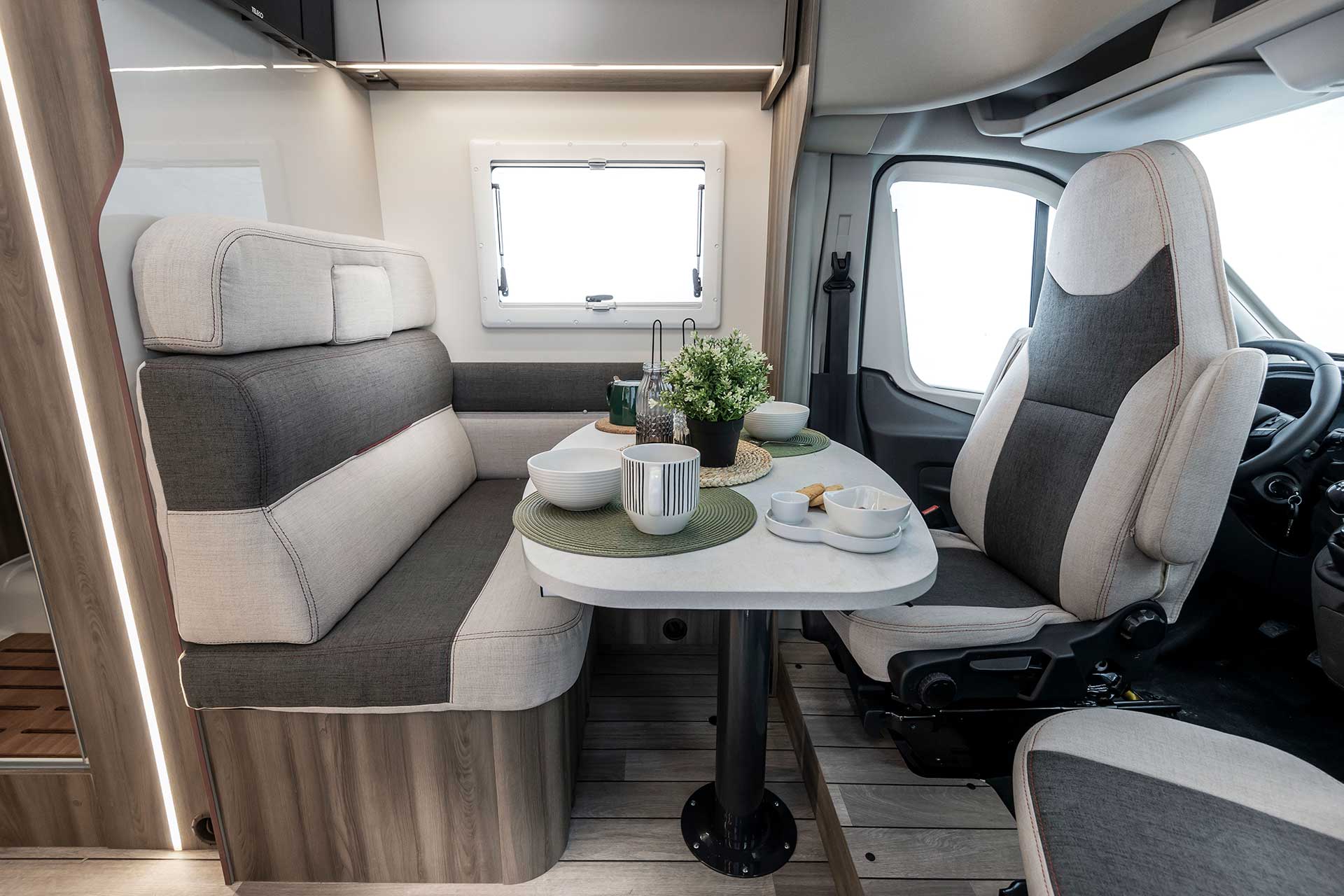 Mit den dreh- und höhenverstellbaren Sitzen lässt sich die Dinette ganz easy umgestalten und bietet so bequem Platz für bis zu vier Personen. Eine geniale Idee ist auch die kleine seitliche Sitzbank unter dem Fenster. Sie kann entweder bei den Mahlzeiten als zusätzlicher Sitzplatz genutzt werden oder auch, um die Beine hochzulegen.