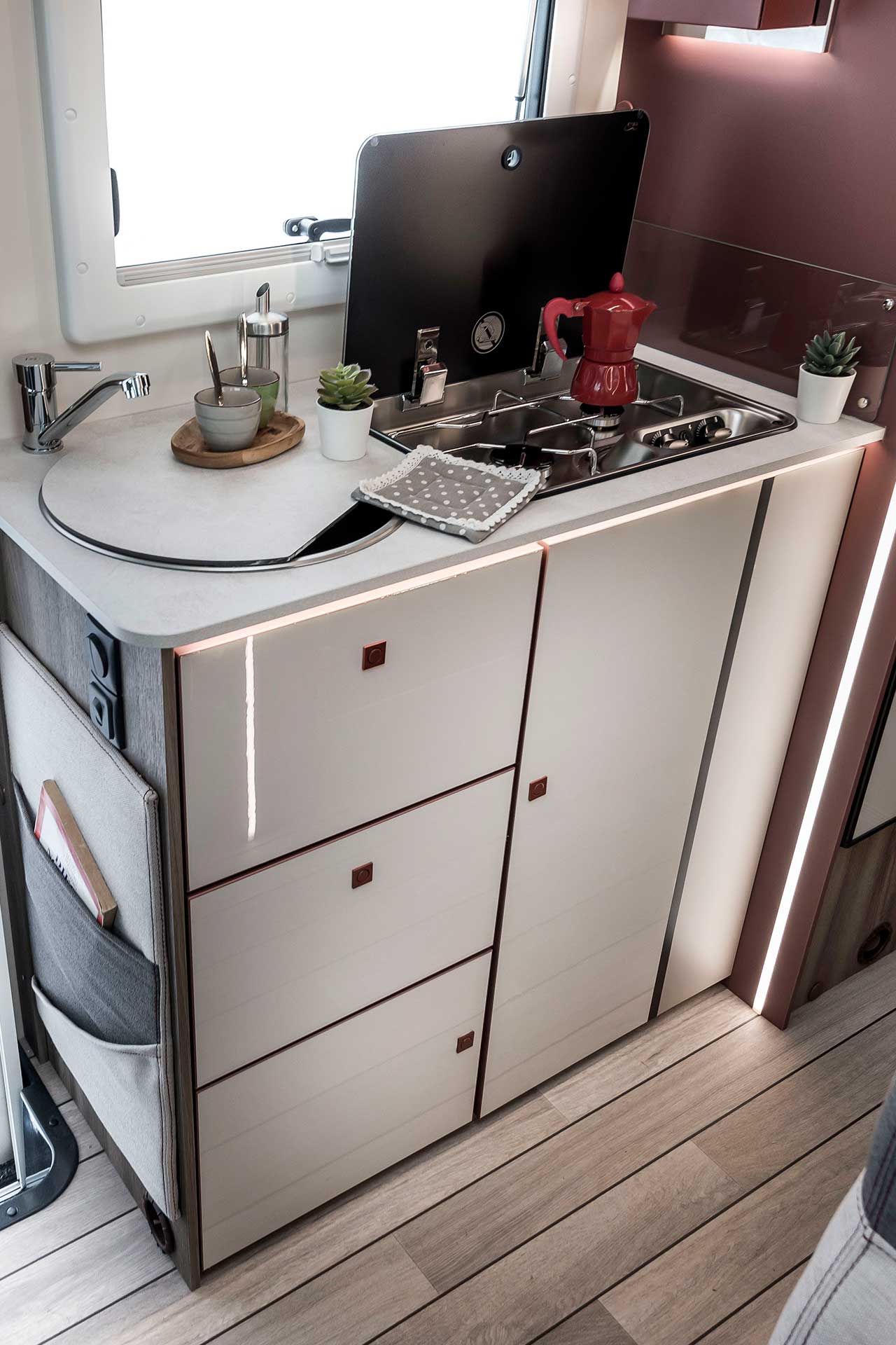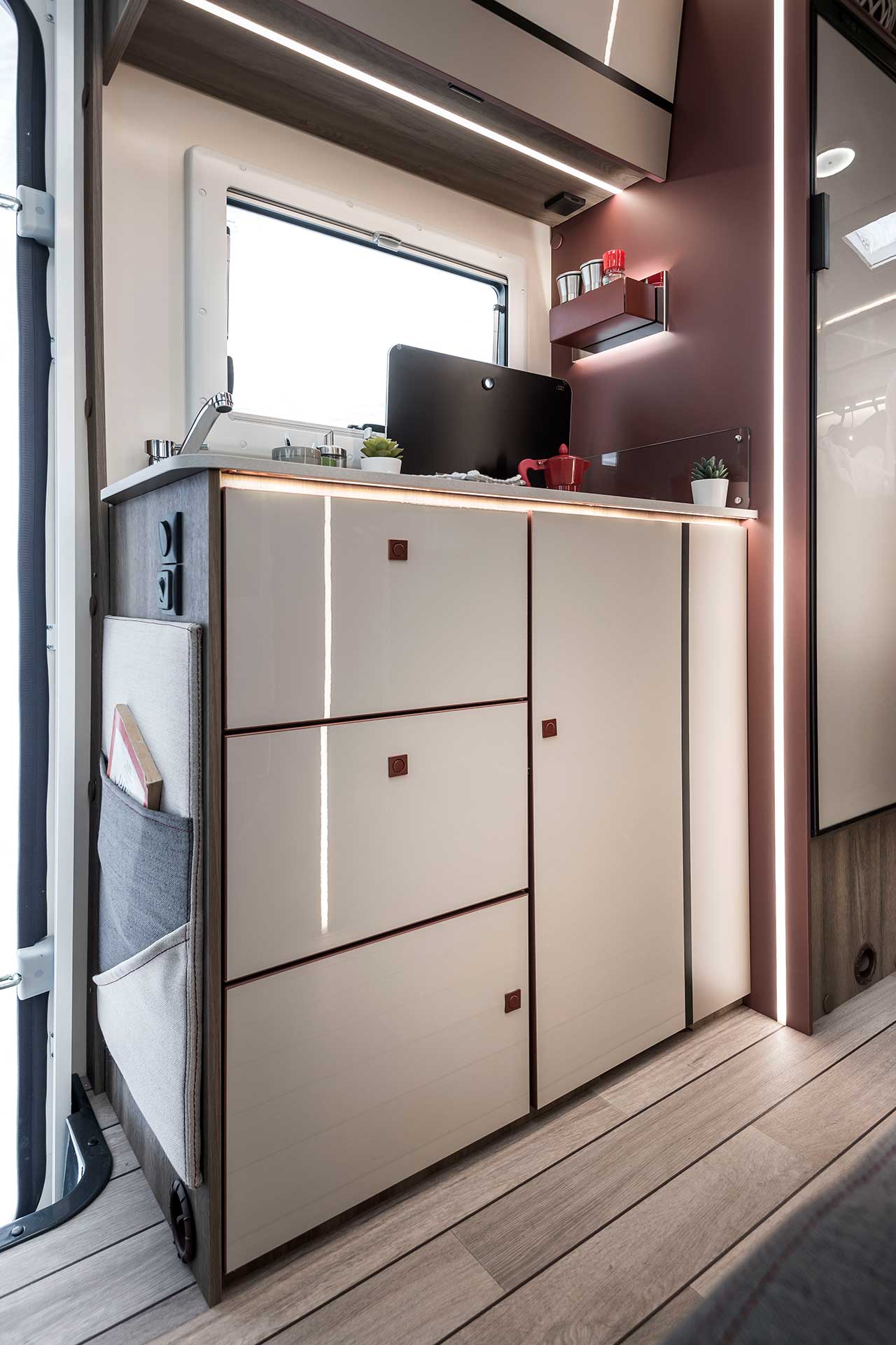 Die Küche strahlt mit ihren hellen Hochglanzfronten und den bordeauxroten Akzenten eine moderne, einladende Atmosphäre aus und passt perfekt in das Gesamtbild. Mit einem großen 137 Liter-Kühlschrank und viel Stauraum lädt sie geradezu zum Kochen ein.